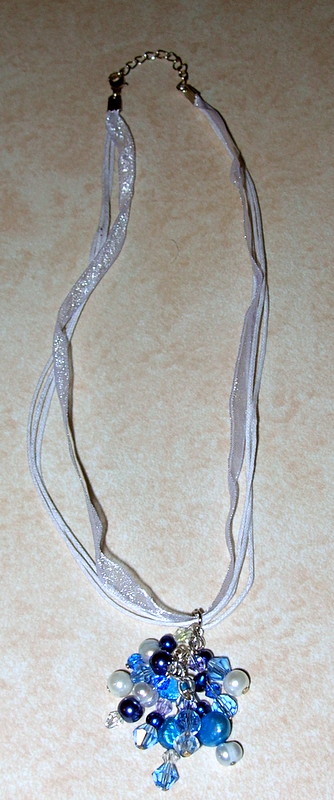 Small Pearl cluster necklace: Made to order -Shades of dark and light blue, clear & white, freshwater pearls, glass pearls and swarovski crystals. They are all on sterling silver posts and wrapped on sterling silver plated chain, attached to organza ribbon which is adjustable for length and has a lobster claw clasp.....$25