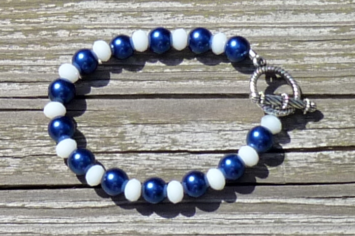 8mm Navy blue glass pearls with white alabaster rondelle bevelled cut swarovski crystals on sterling silver plated wire with silver plated toggle clasp..........7" long