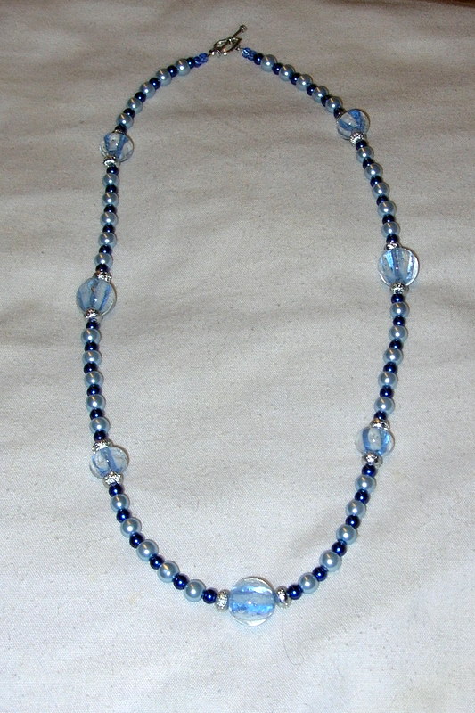Beautiful round light blue/blue & white lampwork beads with 4mm violet blue glass pearls, 6mm light sky blue glass pearls and silver stardust rondelles on each side of the lampwork beads all on stainless steel wire with silver plated heart toggle clasp.