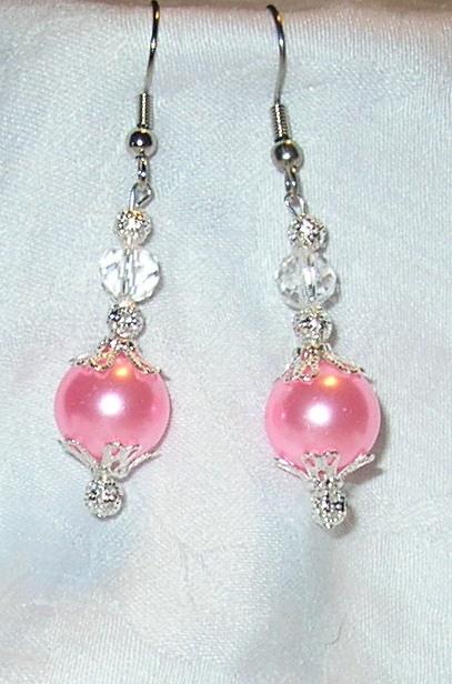 Pink glass pearl with silver plated bead caps, silver plated fillegree rounds and clear sparkling rondelle glass crystal beads on sterling silver headpins with surgical steel ear wire.