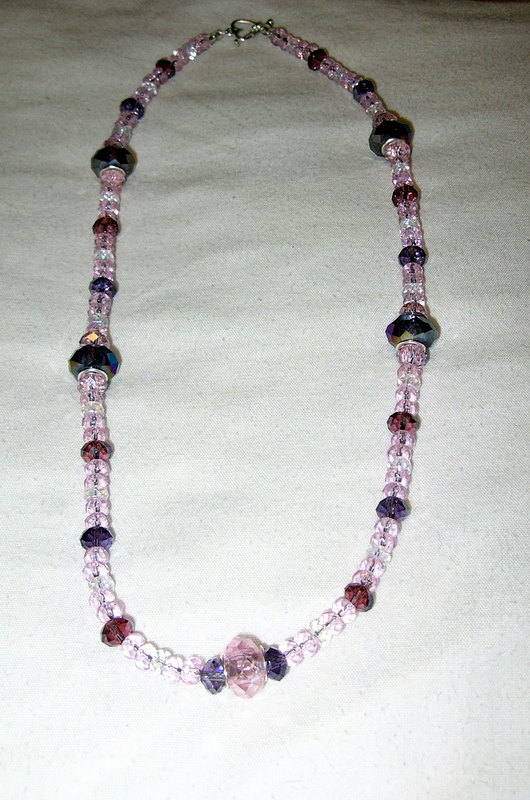 Light pink and clear 4mm glass rondelle beads, 6mm amethyst, pink & tanzanite rondelle glass beads with large rondelle purple iridescent and pink glass beads on stainless steel wire with silver plated heart toggle clasp this baby shimmers.